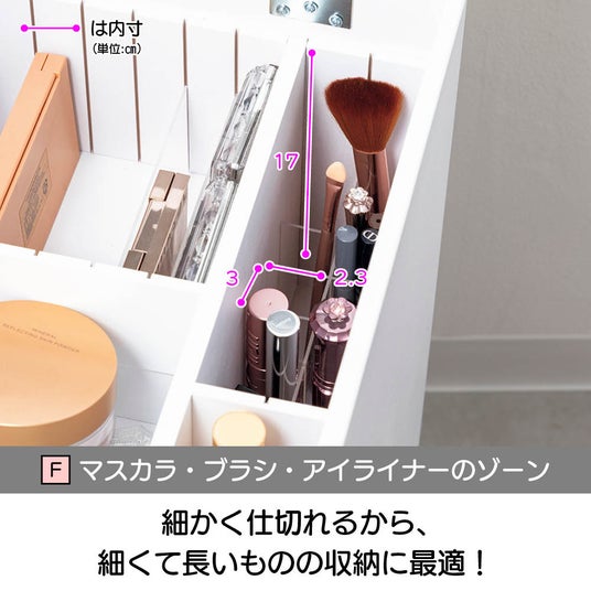 右奥は、マスカラやブラシ、アイライナーなど、細くて長い形状のアイテム専用のゾーン。ロングリップを入れるのも◎。4枚の横仕切りは固定されていないので、柔軟な仕分けが可能です。
