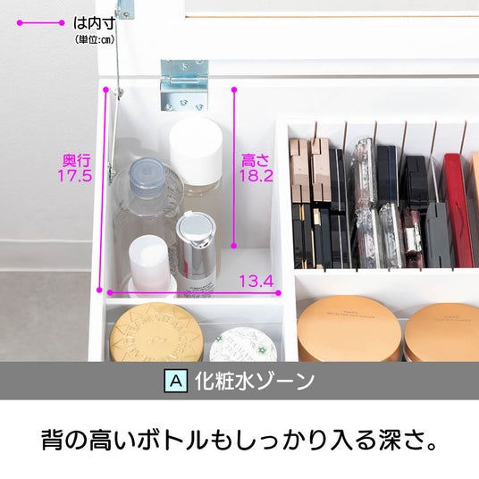 左奥は化粧水などの収納を想定したゾーン。内寸約18.2(深さ)×約13.4(幅)cmあるので、背の高いボトルもしっかり入ります。