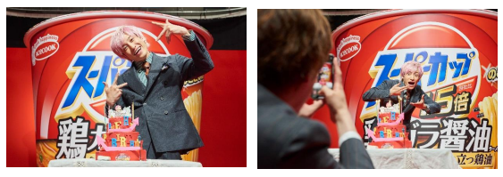 シックなスーツの“大人カッコいい”姿で登場したEXITのお二人。普段の雰囲気とのギャップに現場がざわめきます。お二人が同時に「これぞ大盛り1.5倍!スーパーカップ1.5倍!」とセリフを決めるシーンでは、巨大パッケージを挟みお互いの声が届きにくく、タイミングが合わずに苦戦する場面も見られました。