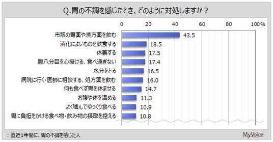 直近1年間に胃の不調を感じた人の対処法は(複数回答)、「市販の胃薬や漢方薬を飲む」が43.5%です。「消化によいものを飲食する」「休養する」「腹八分目を心掛ける、食べ過ぎない」が各2割弱で続きます。