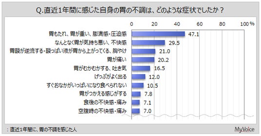 直近1年間に胃の不調を感じた人の症状は(複数回答)、「胃もたれ、胃が重い、膨満感・圧迫感」が47.1%、「なんとなく胃が気持ち悪い、不快感」「胃酸が逆流する・酸っぱい液が胃から上がってくる、胸やけ」「胃が痛い」が各20%台です。