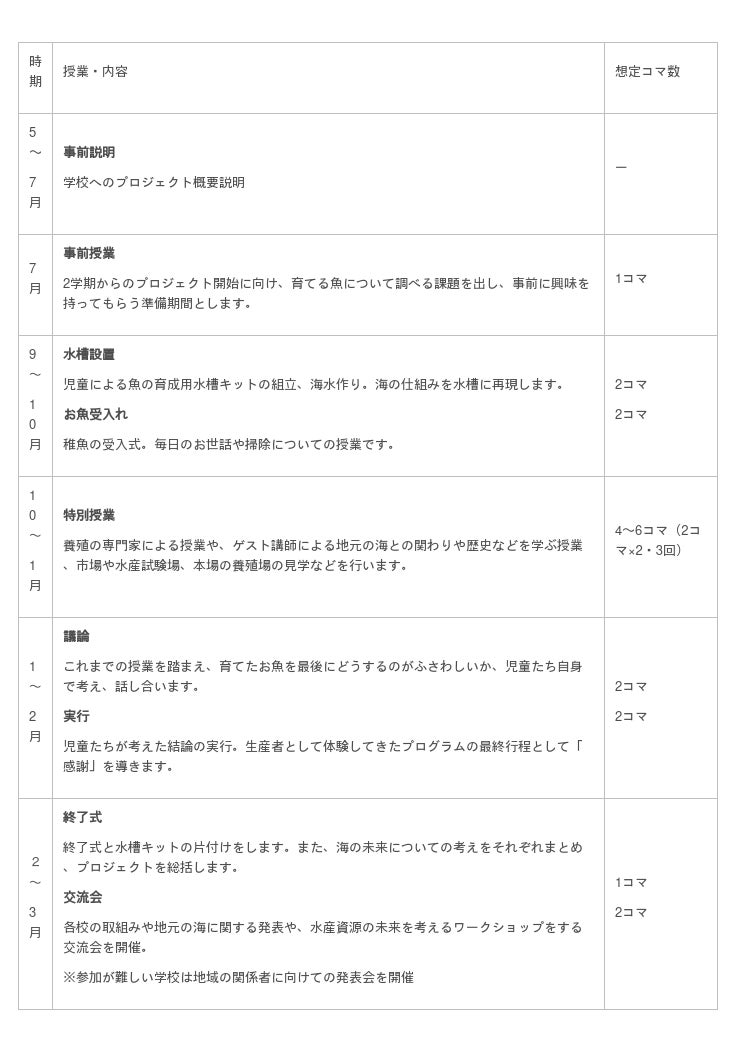 ※生き物を育てるプロジェクトのため、スケジュール通りに進まない可能性もございます。万が一期間が延長した場合、6年生は卒業となり、期間延長が難しい場合があると思いますので、6年生での実施をご希望される学校へ事前にご相談させていただく場合があります。