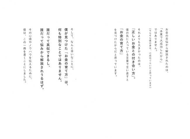 本書では、「生活保護」状態だった少年時代に発見した、お金の本質。学生時代にアメリカで教わった、マネーの常識。ハーバード大時代に学んだ、お金との賢い付き合い方。投資歴25年以上の投資経験をもとに語る、無理なくお金を増やす方法。など、これからの時代に必須となるお金にまつわる知識を、惜しげもなく紹介します。