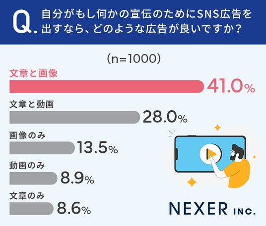 ■41%が、自分がもし何かの宣伝のためにSNS広告を出すなら、「文章と画像」