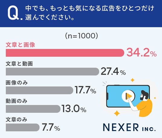 「もっとも気になるもの」でも順位は変わらず、文章と画像が最多の34.2%、文章と動画が27.4%、次いで画像のみ・動画のみ・文章のみという結果でした。