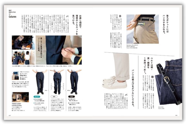 本書では、コーディネートだけでなく、豆知識やお手入れの参考になるようなコラムも満載。ブランドごとのシルエット・ディテールの比較や、パンツに合わせる靴・靴下の提案など、実用的なコンテンツも盛り沢山なので、お手持ちのアイテムの中で組み合わせるとき、また、新たにアイテムを買い足すときの助けにもなるはずです。