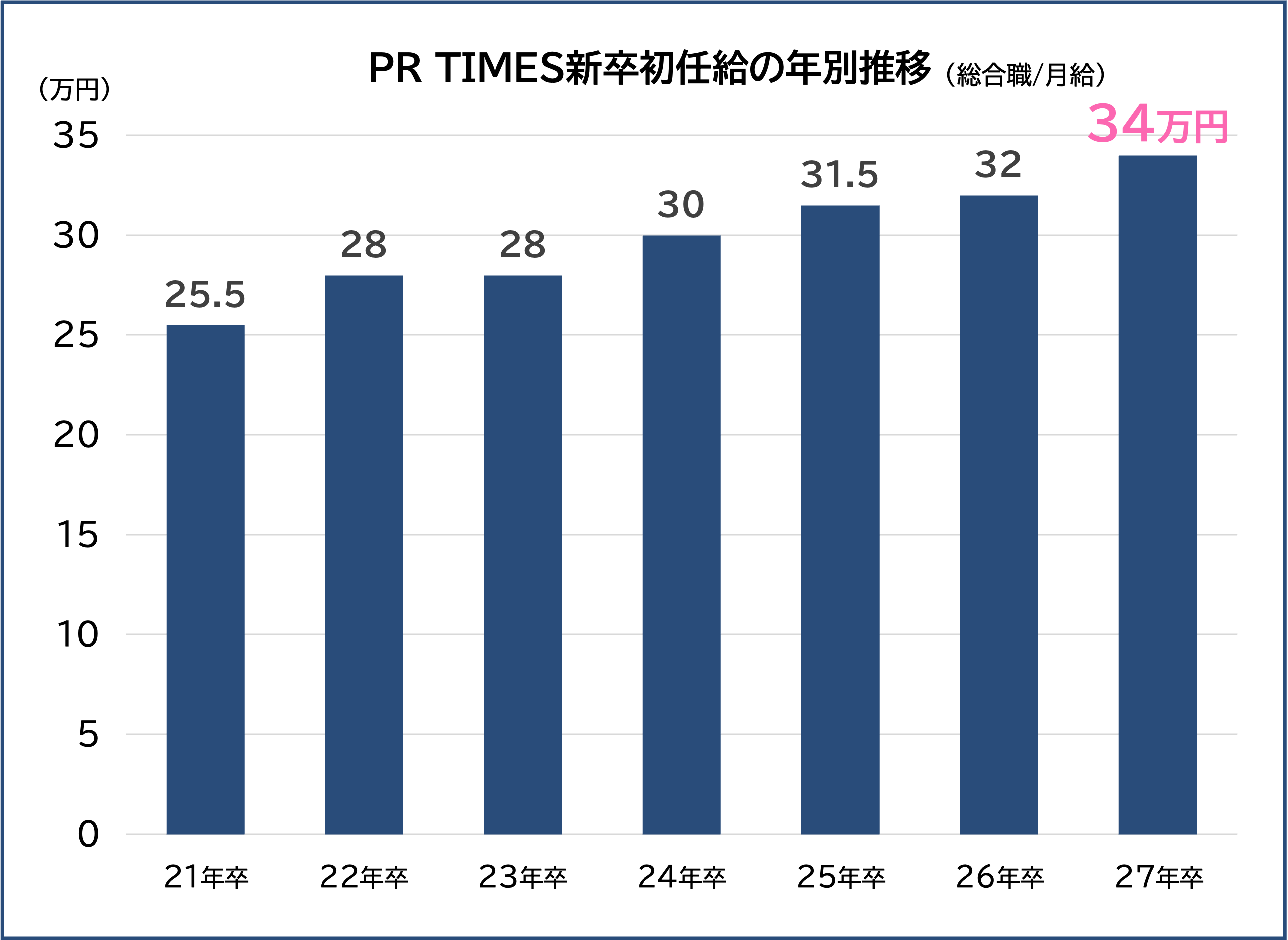 プレスリリース配信サービス「PR TIMES」等を運営する株式会社 PR TIMES(東京都港区、代表取締役:山口拓己、東証プライム:3922)は、27年新卒の総合職・開発職を対象とした初任給の引き上げを決定いたしました。初任給の増額は、24年新卒以降4年連続、直近6年間で累計5回目の引き上げとなり、27年卒は月給34万円で2万円増額いたします。また今回の初任給引き上げにより職種の差をなくし、同一初任給を採用いたします。
