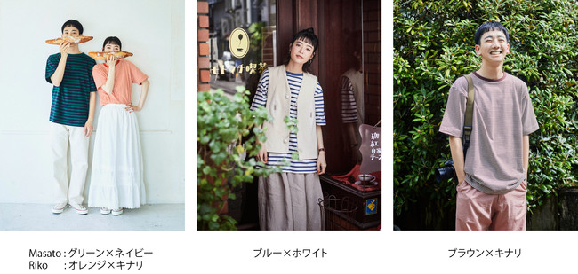 今回はロゴTシャツとボーダーTシャツをコラボレーション。ロゴTシャツは、着た時に元気になれるようなポジティブなメッセージをRikoさんが選び、書き下ろした文字をロゴとしてプリントしました。さらに、鎖骨が見えるネックデザイン、落ち感のある綿100%素材を使用するなど、カジュアルは残しつつ女性らしさを大切にしたいという、Rikoさんならではのこだわりが詰まった1枚ができました。また、「パートナーと一緒に着れるTシャツがあったらいいな。」という2人の想いから、Mサイズはレディース、Lサイズはユニセックスで着れる2サイズのボーダーTシャツを作りました。サイズ感だけでなく、女性が着やすいピッチの細いミジンボーダーと、男女ともに定番として着れるレギュラーボーダーの2種類を作るなど、一緒に着やすいよう柄やカラーにこだわりました。