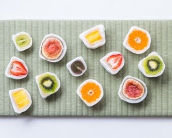 市場から直送の季節のフルーツを、甘さ控えめの白餡と求肥で手包みしました。