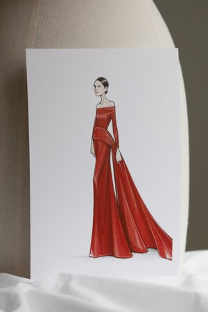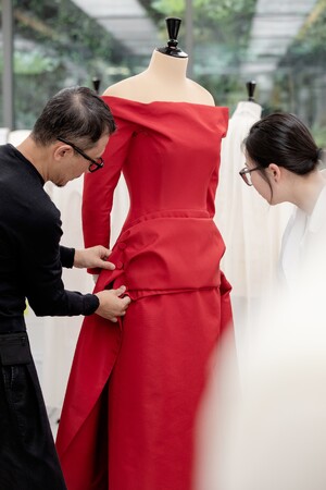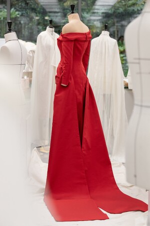 ジュリエット・ビノシュは、ボリュームのあるネックラインが特徴的な赤のシルクフェイユのオートクチュールドレスを纏いました。このドレスは、1949年秋冬コレクションの「FRAC」ドレスからインスパイアされたもので、ディオール アトリエでの制作には30メートルの生地が使われ、550時間が費やされています。