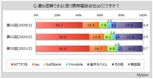 最も信頼できると思う携帯電話会社は、「NTTドコモ」が43.7%、「au」が15.6%、「SoftBank」が7.9%です。