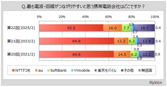 最も電波・回線がつながりやすいと思う携帯電話会社は、「NTTドコモ」が55.5%を占めますが、2023年調査と比べて大きく減少しています。「au」が16.0%、「SoftBank」が7.7%です。