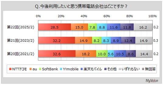 今後最も利用したい携帯電話会社は、「NTTドコモ」が28.5%、「au」が15.0%、「楽天モバイル」が11.6%です。