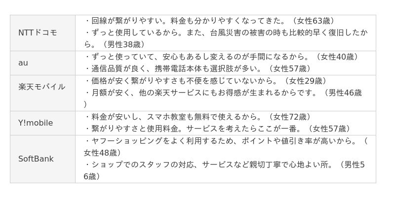 現在利用している会社と同じ会社を利用したいと回答した人の比率は、「NTTドコモ」主利用者で8割強、「楽天モバイル」「au」主利用者で各70%台、「SoftBank」「Y!mobile」主利用者で各6割強となっています。