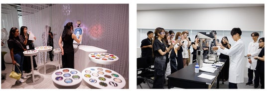〈COCO LABにて自然な色彩と質感を活かしたメイク体験〉〈研究員による乳化技術説明と体験の様子〉