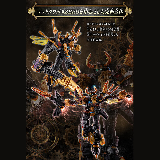 10体の昆虫型ロボ「シュゴッドZERO」が変形・合体し、「キングオージャーZERO」が完成します。シュゴッドZEROでは本来のカスレ塗装の部分のデザインが変わっており、別売りの「DXキングオージャー」とは違うデザインになっています。