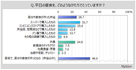 「自分や家族が作った弁当」は26.7%、女性10・20代では5割、女性30~40代では各4割弱となっています。