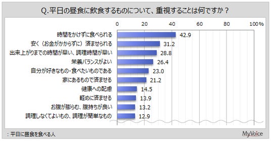 平日に昼食を食べる人に、メニューの重視点を聞いたところ(複数回答)、「時間をかけずに食べられる」が42.9%、「安く済ませられる」が31.2%、「出来上がりまでの時間が早い、調理時間が早い」28.8%です。