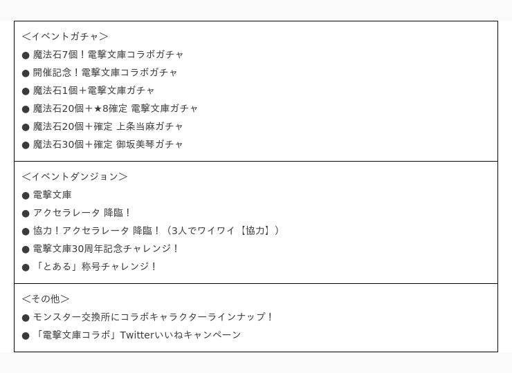 初めて「上条当麻」を入手すると「電撃文庫ドロップ」が解放されます。また、「魔法石30個+確定 御坂美琴ガチャ」を購入すると、おまけとして「とある魔術の禁書目録のBGMセット」がメールで届きます。メールを開封して、「とある魔術の禁書目録のBGMセット」を解放しましょう。