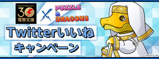 その他、「電撃文庫」とのコラボ実施を記念して、Twitterいいねキャンペーンを開催します。パズドラ公式Twitterアカウント(@pad_sexy)をフォローして、対象のツイートを「いいね」しましょう。対象ツイートの3万「いいね」達成で、「電撃文庫コラボガチャ」×1回を全てのユーザーの皆様へプレゼントします。たくさんの「いいね」をお待ちしております。