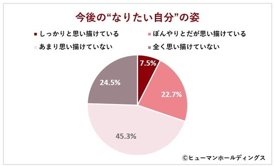 「今後の“なりたい自分”の姿を思い描けているか」という質問に対し、思い描けているのは3割で、「あまり思え描けていない(45.3%)」、「まったく思い描けていない(24.5%)」という結果になり、69.8%は“なりたい自分”の姿を思い描けていない状況が伺えます。