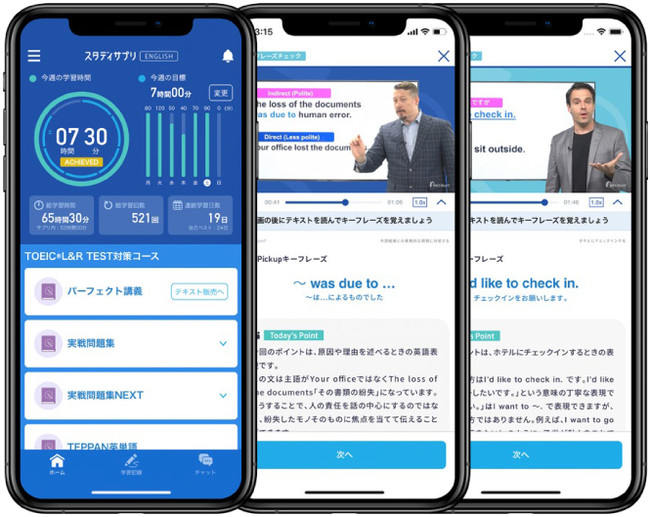 1回3分からの隙間時間で英語学習ができるアプリ。大人の英語学習では新日常英会話コース / TOEIC(R) L&R TEST対策コース / ビジネス英語コースがあり、TOEIC(R) L&R TEST対策コースでは業界初、オンライン完結型コーチングを実現したパーソナルコーチプランも提供しています。2021年には、新日常英会話コース、ビジネス英語コースにオンライン英会話がセットになったプランも登場。