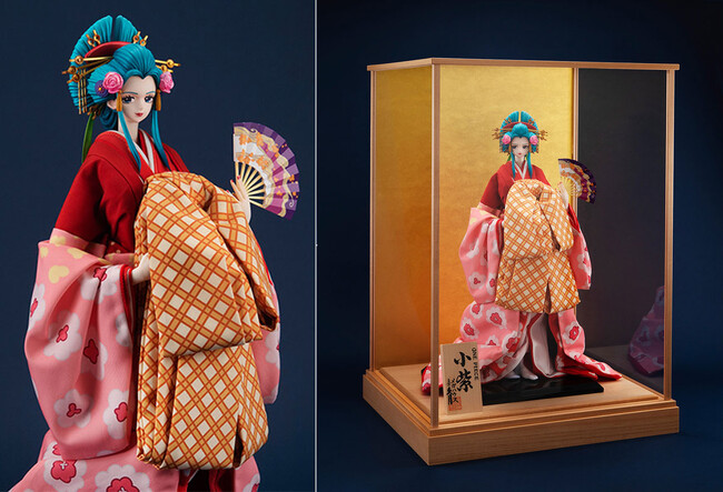 「ワノ国」編に登場する妖艶な花魁「小紫」の鮮やかな着物は、設定に忠実な柄をプリントした生地を本商品のために作り起こし使用。