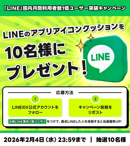 LINEヤフー株式会社(以下、LINEヤフー)が運営するコミュニケーションアプリ「LINE」は、国内月間利用者数※1が1億ユーザー※2を突破しました。本日より、「LINE」に関する特設サイトを公開したほか、オリジナルクッションが当たるSNSキャンペーンを実施します。