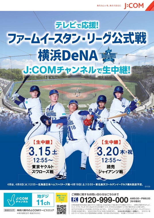 株式会社ジェイコム湘南・神奈川(J:COM、所在地:神奈川県横浜市、代表取締役社長:京克樹)は、横須賀スタジアム(神奈川県横須賀市)他で開催される、2025年度イースタン・リーグ選手権試合(ファーム公式戦)における横浜DeNAベイスターズ戦(ホームゲーム71試合)のうち、注目の15試合以上を、J:COMのコミュニティチャンネル「J:COMチャンネル」(地デジ11ch)で2025年3月15日(土)より生中継します。