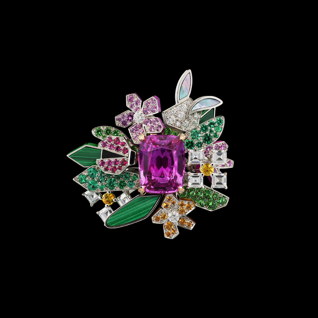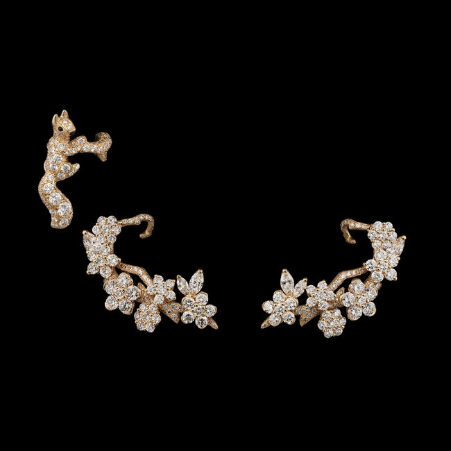 おとぎ話のようなイラストの世界を再解釈し、色調とボリューム感の組み合わせで美しさがより際立つ、小さくも最上級の フレスコ画のように、新作コレクションはミリー ラ フォレの庭園を軽やかに散策するよう誘います。それぞれのピースには 詩情豊かな動植物が印象的にあしらわれ、魅力的なデザインが目を引きます。ゴールドのウサギは、煌めくダイヤモンドが パヴェセッティングされた茂みに飛び込み、2羽のフクロウは、燃えるように赤いルビーに彩られた枝の間を羽ばたきます。堂々たる白鳥は、輝くブルーサファイアに縁取られた池の中心に姿を見せ、クチュールと自然を融合したデザインにはキツネ、リス、シカが登場し、そのすべては鮮やかなクリソプレーズで引き立てられています。さらにはイエローとピンクゴールドの葉が青々と茂るシュラブと優美な花びらを模したジュエリーが散りばめられた花壇が、ポエティックな演出を最高峰の輝きに溢れるジュエリーへと昇華させます。第2章「ディオリガミ」の幕開けを告げる、繁茂する緑の草木を豊かに表現したネックレス、リング、イヤリングが、壮麗なコレクションの豪華絢爛なフィナーレを飾ります。