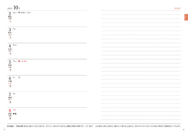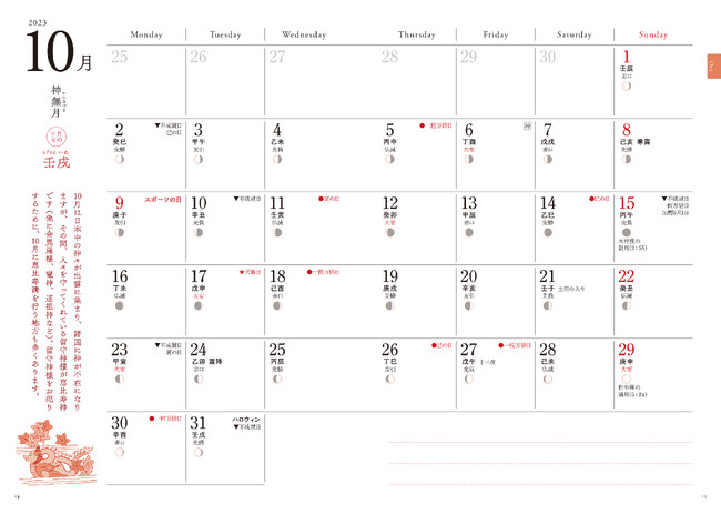 水晶玉子先生オリジナルの月間カレンダーには、大安・仏滅などを示す「六輝」や「二十四節気」などの和暦に加え、一粒万倍日・天赦日などの「金運・開運日」などを網羅。吉日をうまく予定に取り入れることで、日々のスケジュール管理を助けながらあなたの運気を毎日上げてくれます。良い日を選んで積極的に行動し、悪い日を避けてリスクを回避する…。日々の生活はもちろん、ビジネスシーンにも活用できる開運カレンダーです。