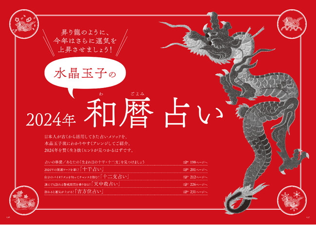 毎年秋に発売してご好評をいただいている『水晶玉子 開運・和暦ダイアリー』は、今年で3年目を迎えます。愛用者からの声を取り入れ、2024年バージョンは占いページをこれまでより倍増し、コンテンツも充実。例年掲載していた「十二支占い」「天中殺占い」に加え、その年の開運ワードを導く「十干占い」、さらに九星気学に基づく「吉方位占い」も新たにプラスしました。