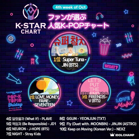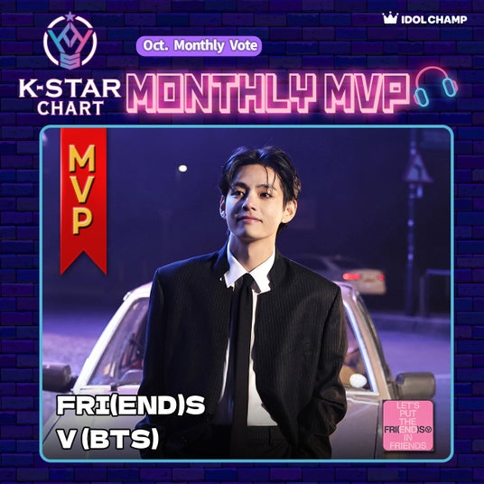 『K-STAR CHART presents POP-K TOP10 Friday』週間チャートの投票数をベースに算出された10月の累計ポイント数で決まる月間チャート1位は V (BTS)の「FRI(END)S」となり10月のMVPとして番組内で放送されました。