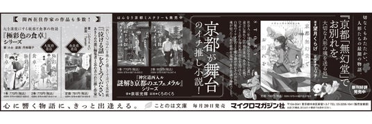 マイクロマガジン社(東京都中央区)は、ことのは文庫『京都「無幻堂」でお別れを 大切な人形の魂を送る処』、『神宮道西入ル 謎解き京都のエフェメラル』シリーズ、『「泣ける話」をひとつください。 あきらめの悪い編集者と忘れ去られた推し作家』、『極彩色の食卓』シリーズを京都新聞に掲載いたしました。
