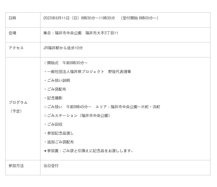 一般社団法人福丼県プロジェクトは、5月27日~6月11日に開催される日本財団と環境省が主催する全国一斉キャンペーン「春の海ごみゼロウィーク」に合わせ、6月11日に福井まちなか一斉ごみ拾いを開催いたします。このイベントは、日本財団が推進する海洋ごみ対策プロジェクト「海と日本プロジェクト・CHANGE FOR THE BLUE」の一環で開催するものです。