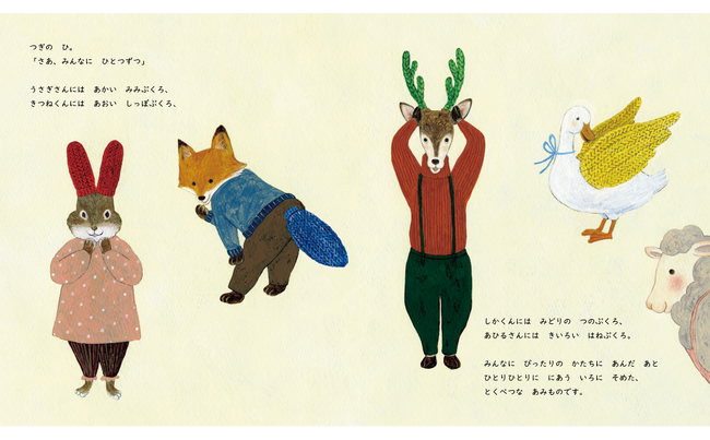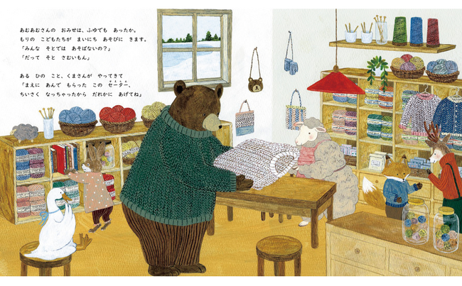 浅野みどりさんのイラストはどこか異国の雰囲気を感じさせ、色づかいや質感などとてもお洒落で幅広い年代の方に愛されています。動物たちや冬の森の風景、毛糸でいっぱいの編み物屋さんのお店の中など、細部まで丁寧に描き込まれた絵はじっくり見入ってしまいます。