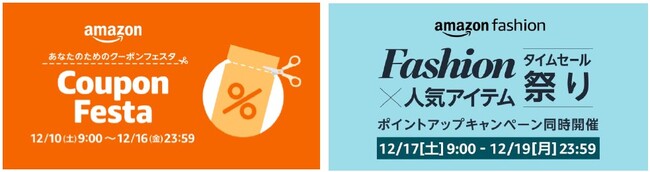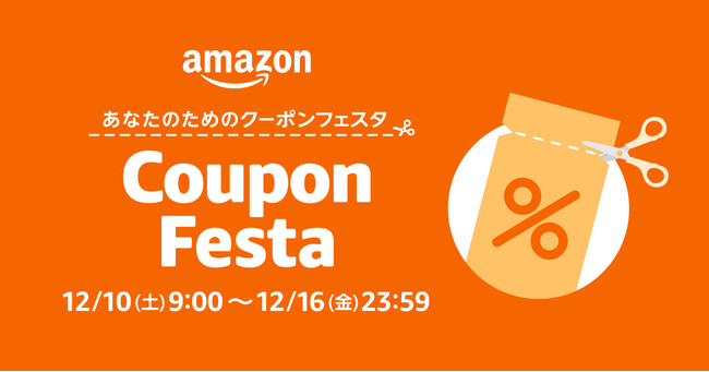 12月10日(土)から12月16日(金)までの7日間、幅広いカテゴリーの商品からお得なクーポンが多数登場する「Amazon クーポンフェスタ」を初開催します。また、12月17日(土)から12月19日(月)までの3日間、「Fashion x 人気アイテム タイムセール祭り」を実施し、メンズ・レディースファッションアイテムをはじめ、シューズ・バッグ・アクセサリーなどの小物類、ビューティアイテムなどをお得にご提供いたします。