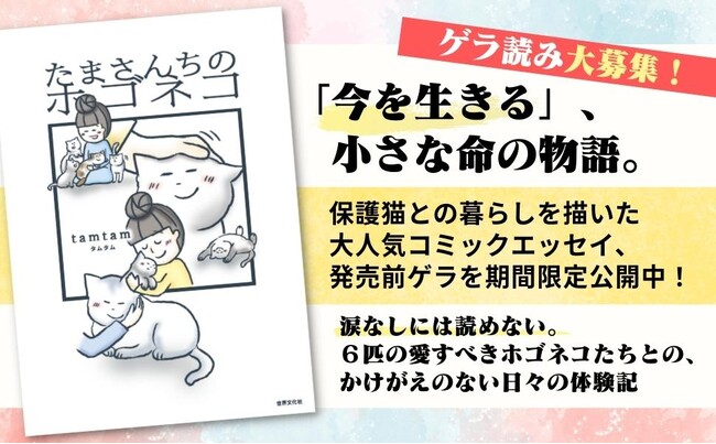 世界文化社は、行き場を失った猫の保護活動の日々を描いたコミックエッセイ『たまさんちのホゴネコ』(2023年10月25日刊行予定)の、発売前ゲラをNetgallyにて期間限定公開いたしました。「今を生きる」ちいさな命の物語を、ぜひご覧ください。本書の著者印税にあたる全額は、猫や犬などの動物福祉活動に充てられます。
