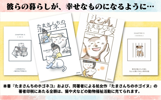 本書『たまさんちのホゴネコ』および前作『たまさんちのホゴイヌ』の著者印税にあたる全額は、動物福祉活動に充てられます。一部は保護猫や保護犬などの支援活動を行っている団体に寄付され、一部は著者自身の保護活動に使われます。
