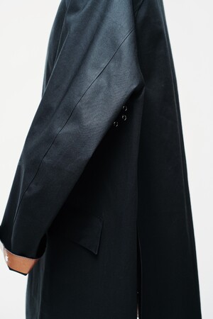 昨年から短い着丈のアウターをよく着るようになったという金子自身の気分を反映しながら、パターンを改良し、動きやすく気軽な選択肢として仕上げた。