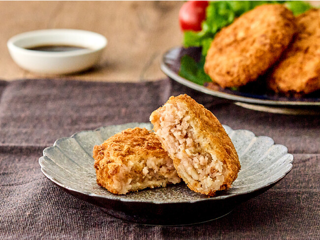 南高梅の酸味にかつお節の風味、隠し味のごま油が食欲をそそる、ソースいらずのコロッケ。ぺろりと完食できてしまう爽やかな和風な味わいは、日本の暑い夏にぴったり! 夏の食卓の定番・そうめんやひやむぎのお供にも最適な一品です。『コロッケのころっ家』の従来商品に比べ、ベースのじゃがいもはしっとり、パン粉はきめ細やかで、食べやすい歯ざわりに仕上げました。
