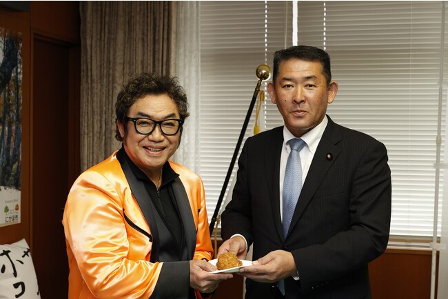 本日、『コロッケのころっ家』を展開するものまねタレント・コロッケは石井浩郎国土交通副大臣を表敬訪問し、日本の半島地域の振興を目指して立ち上がった“半島コロッケ”プロジェクトの始動と、その第一弾となる「かつお香る南高梅コロッケ」の完成と発売開始を報告しました。