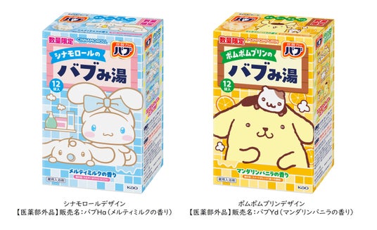 薬用入浴剤「バブ」のシナモロールデザインとポムポムプリンデザインをセットにしてお届けします。