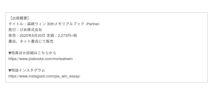 ◆『森崎ウィン 30thメモリアルブック -Partner-』サイト:https://www.piabooks.com/morisakiwin