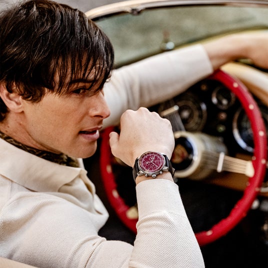 ダイヤルにはレッド文字盤を採用。車のボディを想起させ、スポーティな印象にまとめ上げています。