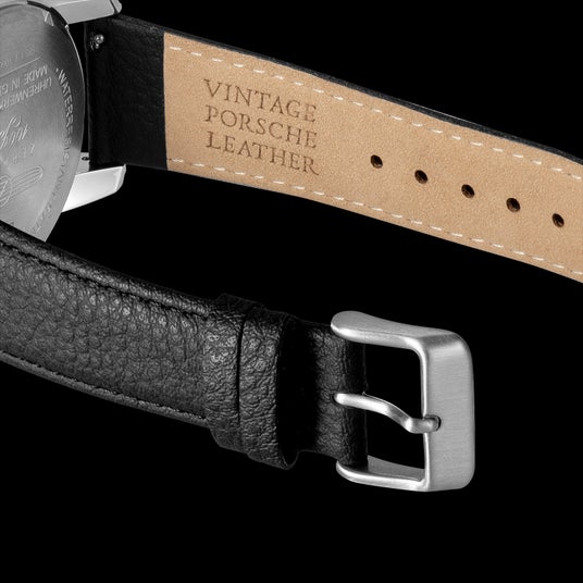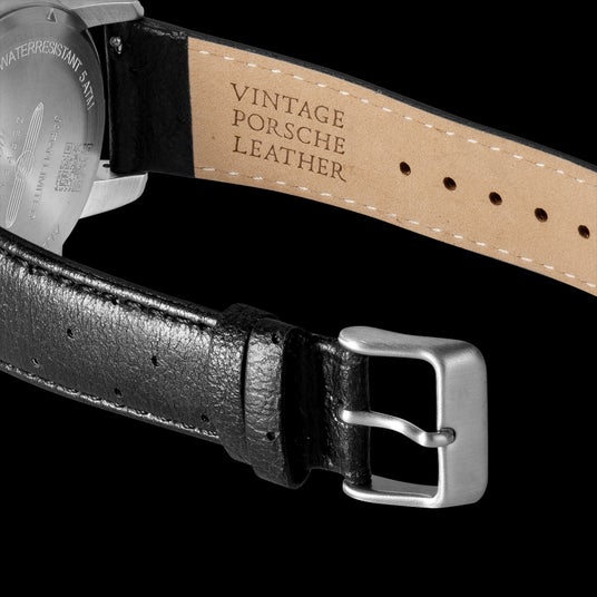 同じドイツを母国とする自動車ブランド、ポルシェの希少なヴィンテージレザーをストラップに使用した数量限定モデルです。