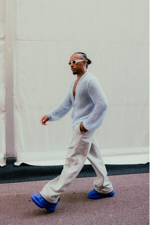 ルイス・ハミルトンはメンズ コレクションより、ライトブルーのディープVネック ジャンパーと、ハンドクラフターのインディゴ染めワイドパンツを着用しました。