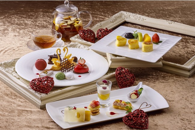 ふっくらと焼き上げたシュー生地に、二種のチョコレートムースとホイップクリームを詰めた小さなスワンシュークリーム、なめらかな口溶けの生チョコレートなど繊細な味わいのスイーツ、エクレア風のチキンムースやハート型のミートパイなど可愛らしい見た目も楽しめるアミューズなど、彩り華やかなメニューの数々をコース仕立てで提供します。