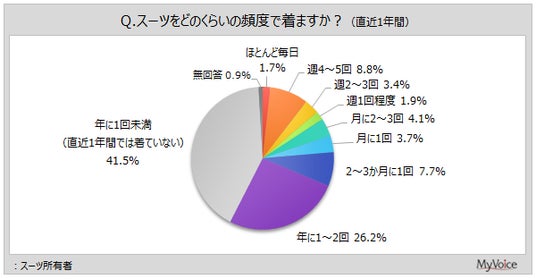 スーツ所有者のうち、直近1年間にスーツを着ていない人は41.5%です。週1回以上着た人は約16%となっています。