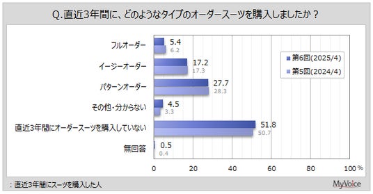 購入したオーダースーツのタイプは(複数回答)、「フルオーダー」が5.4%、「イージーオーダー」が17.2%、「パターンオーダー」が27.7%です。